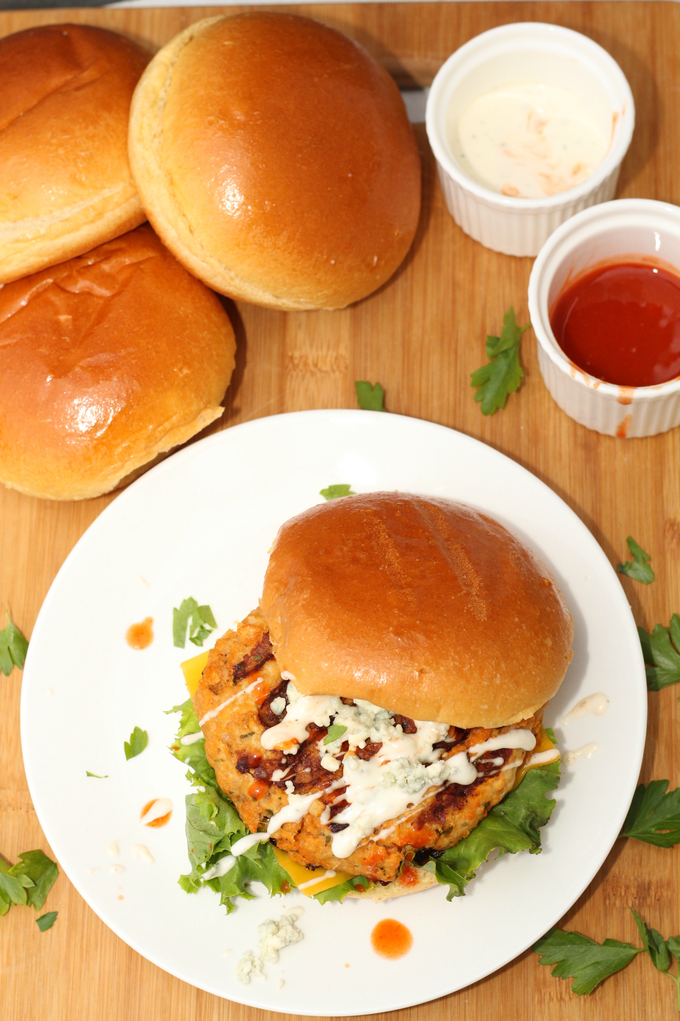 Buffalo Chicken Burgers with Blue Cheese & Ranch