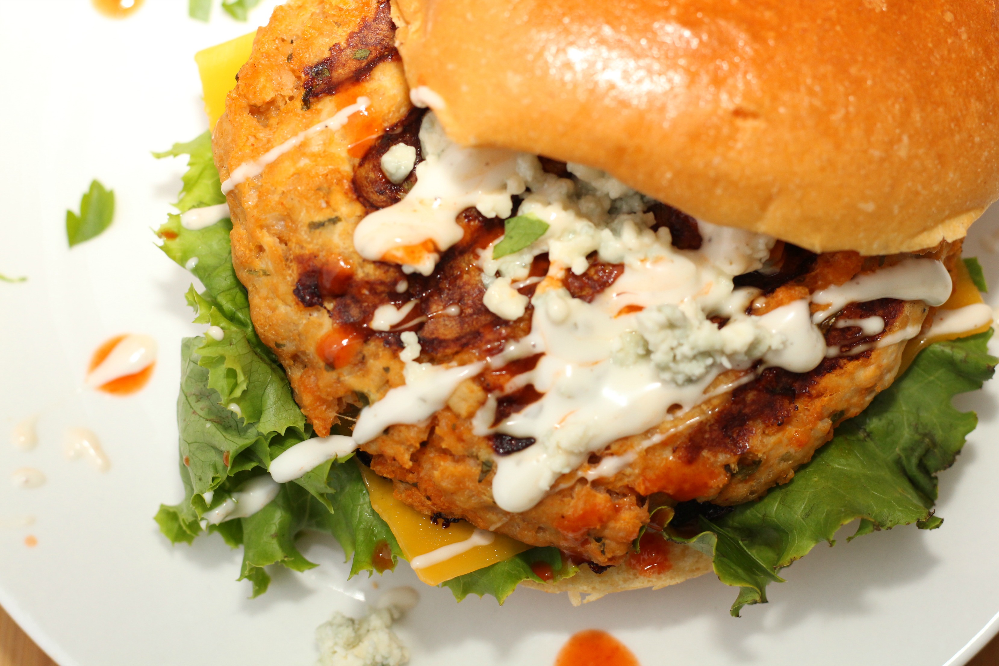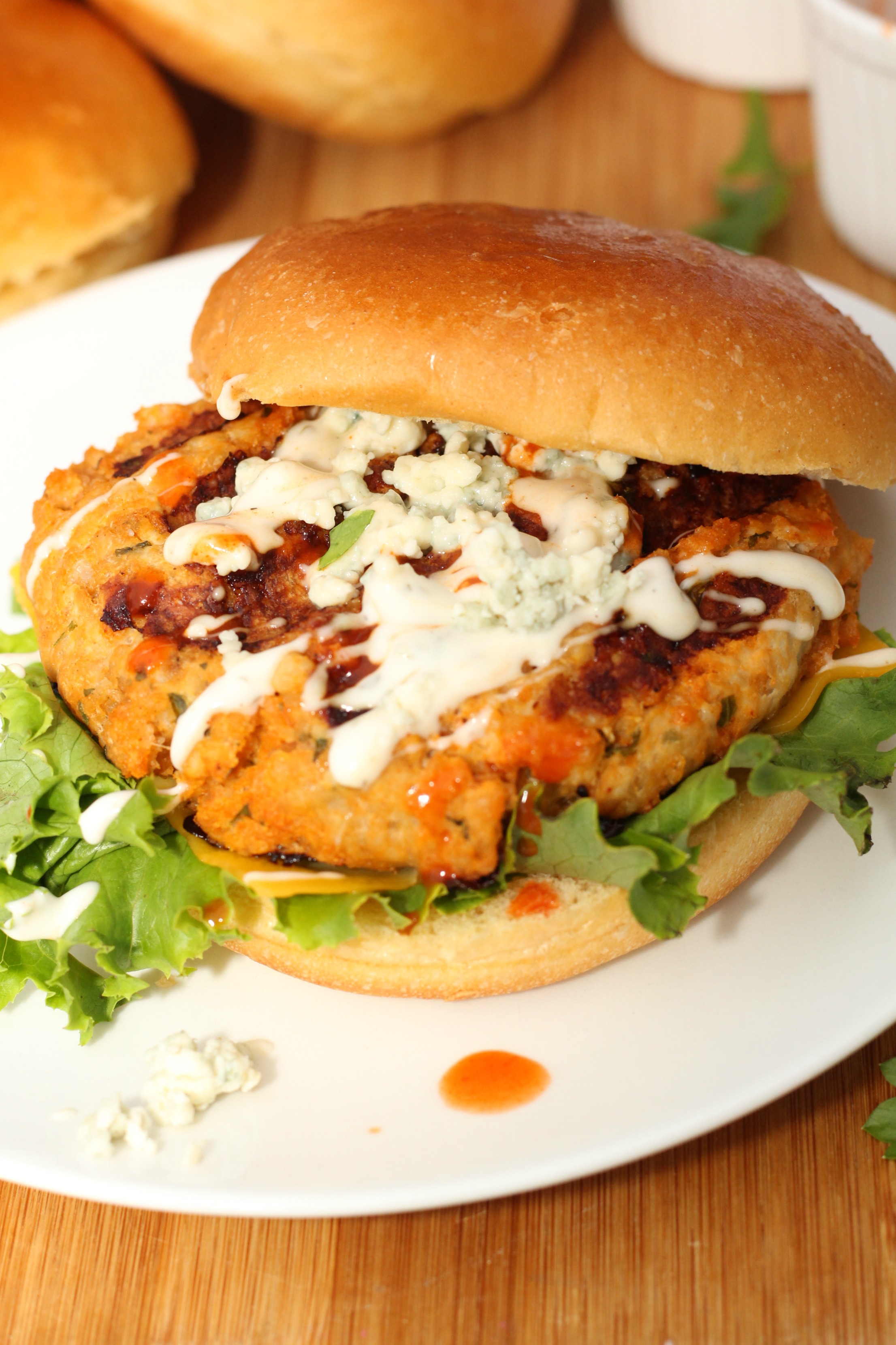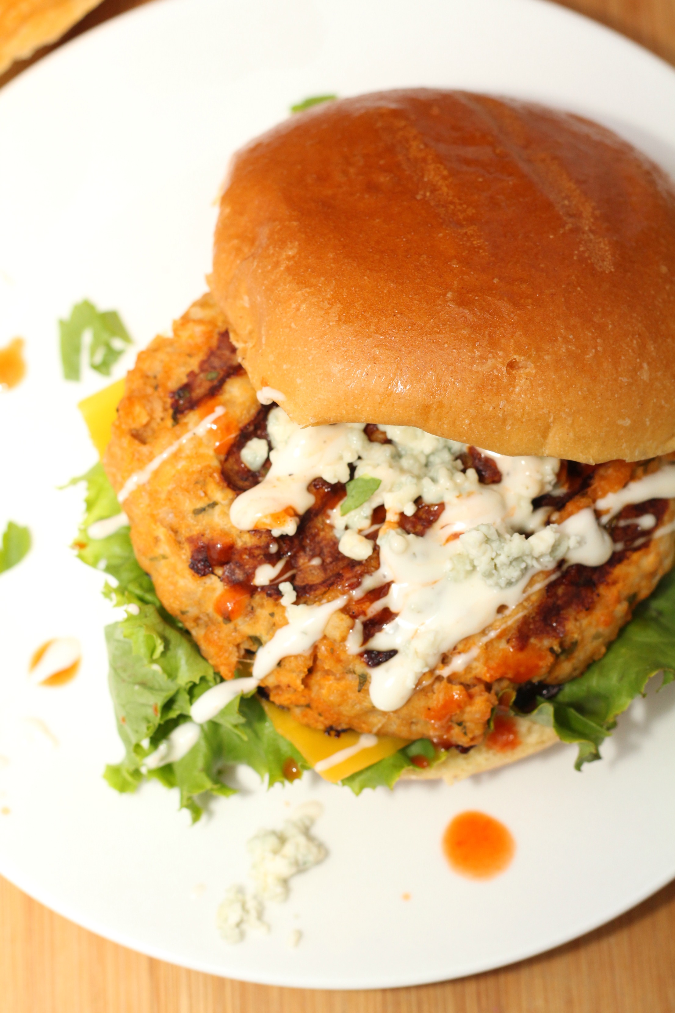Once they were done cooking, I placed a piece of lettuce on the bun with a thin slice of cheddar cheese on top. Then I put the hot burger patty right on to melt the cheese. I topped them off with a drizzle of buffalo wing sauce, some crumbled blue cheese chunks and some ranch dressing.