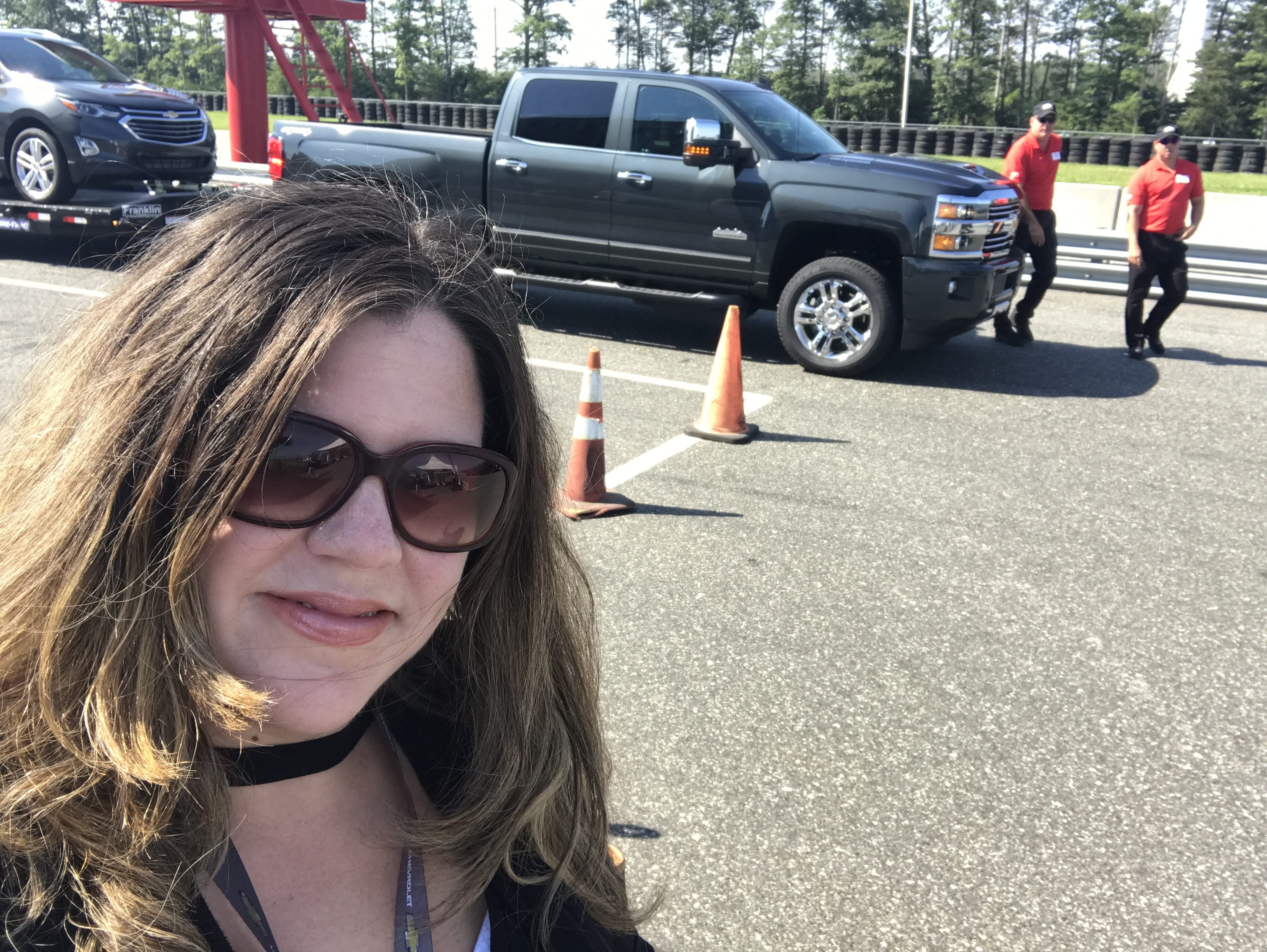 Next up was the driving expereince in the Chevrolet Silverado 25oo HD. As we made our way over to the course, I saw the trucks lined up and waiting for us with one BIG surprise – we were going to be towing another vehicle. Towing. For a girl, who’s never driven a pick-up truck, driving one while towing a Chevrolet Equinox was nerve-wrecking. I wish I had a dash cam in that truck to see my face. My driving parter from Chevrolet, let me know as soon as I closed the door that he is a professional race car driver and not to worry. His chants of “faster, faster” saw me pushing myself out of my comfort zone to driving at speeds of over 75 mph TOWING A CAR. Now listen, driving 75 mph is not that big of deal. I do it all the time. It’s just so different in a big truck pulling a trailer with 6,000 lbs. on it!